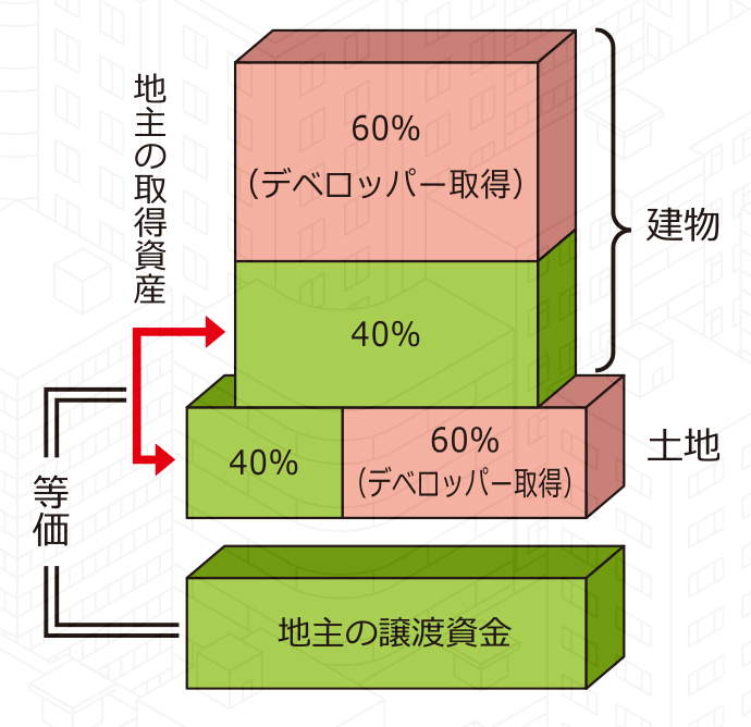 等価交換とは、不動産の所有者(地主)が保有する土地と、その土地上に事業者が建築するマンション(区分所有建物)等の一部を等価で交換する方法(右図)のことです。