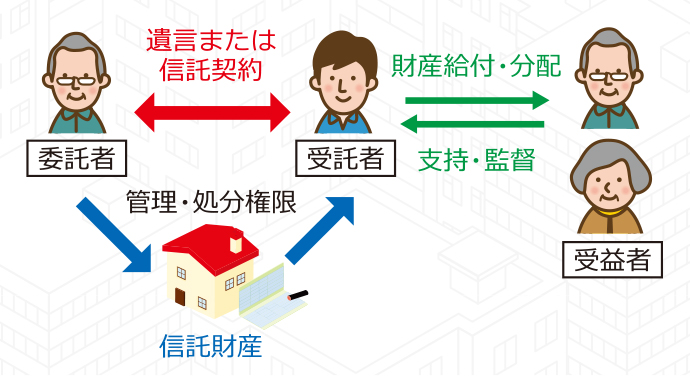 民事信託とは、資産保有者(委託者)が契約により信頼できる相手(受託者)に資産を移転し、一定の目的(信託目的)に従って、特定の人(受益者)のためにその資産(信託財産)を管理・処分する方法のことです。